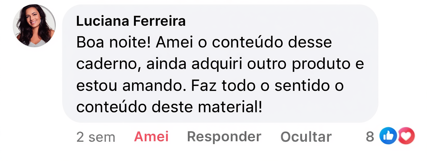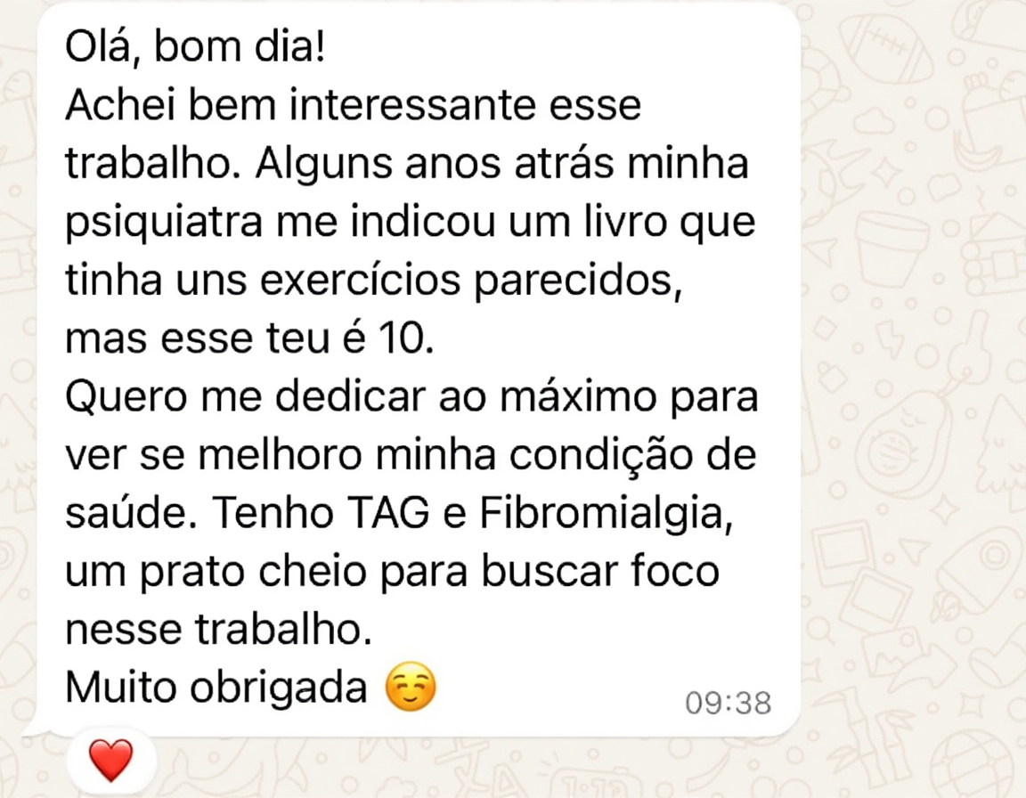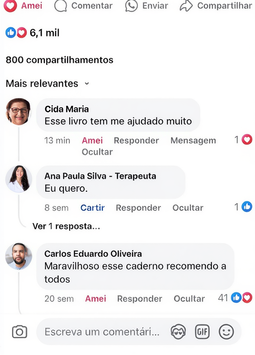 Eu tava me sentindo perdida, sem ânimo pra nada. Acordava cansada, ia dormir chorando. Esse caderno foi um divisor de águas pra mim. Me fez olhar pra dentro, entender meus sentimentos e começar a me cuidar de verdade. Hoje eu me sinto mais leve, mais confiante e com vontade de viver de novo.